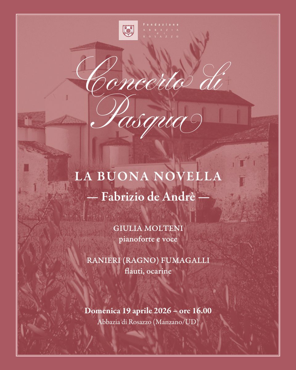 Il tradizionale concerto pasquale, organizzato dalla Fondazione Abbazia di Rosazzo, dal titolo "La Buona Novella" è una rilettura dell’omonimo capolavoro di Fabrizio De André, a oltre cinquantacinque anni dalla sua pubblicazione. Ispirato ai Vangeli apocrifi, l’album racconta la storia della famiglia di Gesù con uno sguardo profondamente umano, capace di restituire voce e dignità ai personaggi più fragili e silenziosi. Considerata dallo stesso De André una delle sue opere più compiute, La Buona Novella nasce da un’urgenza artistica e spirituale che ancora oggi risuona con straordinaria attualità.