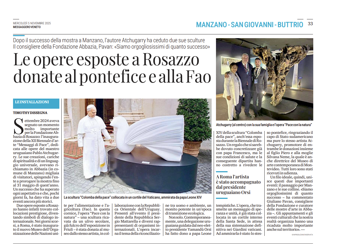 Venerdì 17 ottobre, la delegazione uruguaiana presieduta dal nuovo presidente dell’Uruguay Yamandù Orsi ha regalato al Pontefice Papa Leone XIV la scultura intitolata "Colomba della Pace", opera (ospitata durante la XII Biennale d’arte a Rosazzo) che rappresenta un messaggio di pace, valore che trascende confini e culture. L’opera è già installata in un cortile interno del Vaticano, in attesa di essere collocata nei Giardini Vaticani.