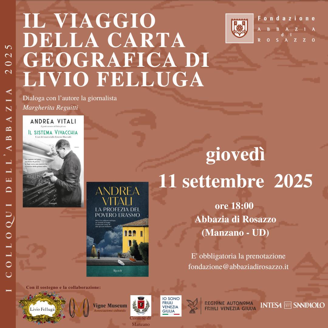i apre l’11 settembre per proseguire fino al 28 novembre la sezione autunno-inverno della X edizione della rassegna “I Colloqui dell’Abbazia. Il viaggio della carta geografica di Livio Felluga”, nella storica Abbazia di Rosazzo (Manzano-Ud), curata e condotta da Elda Felluga e Margherita Reguitti.
