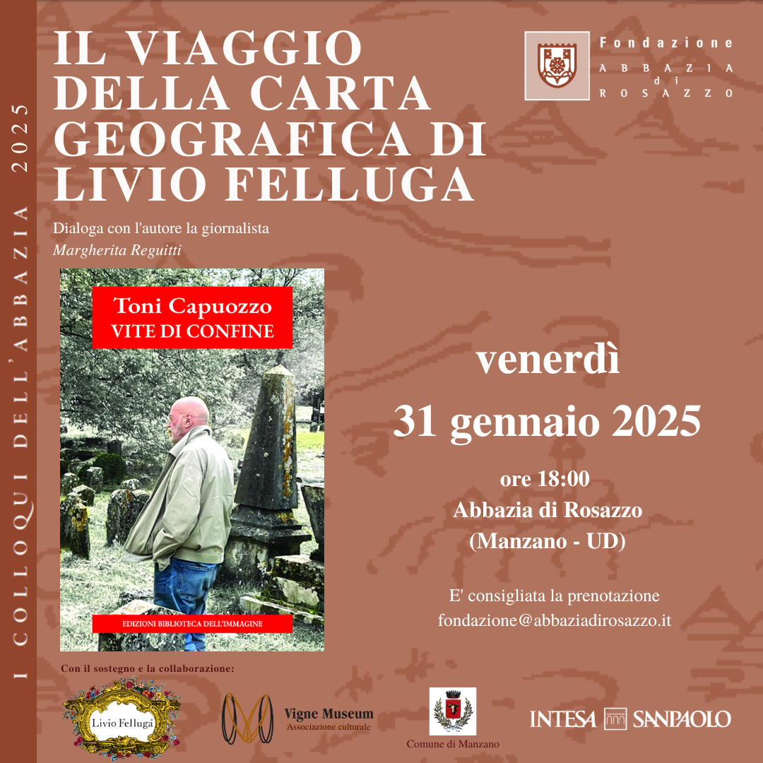 Ricominciano gli appuntamenti de "I Colloqui dell'Abbazia. Il viaggio della carta geografica di Livio Felluga" X edizione della nota rassegna letteraria curata e condotta da Elda Felluga e Margherita Reguitti. A pochi giorni dall'inaugurazione di Gorizia/Nova Gorica Capitale europea della cultura, per il primo appuntamento della rassegna, ospiteremo il giornalista Toni Capuozzo con il suo ultimo libro "Vite di confine" uscito per Edizioni Biblioteca dell'Immagine.