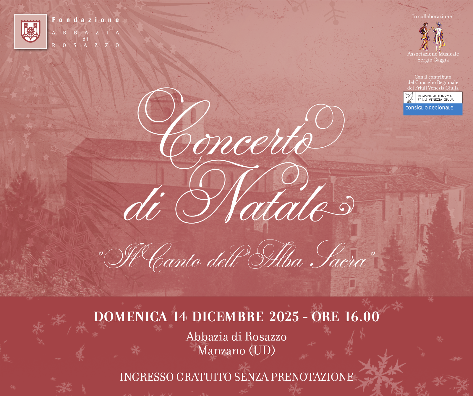 In attesa del Santo Natale si rinnova l’appuntamento, nella Chiesa di San Pietro Apostolo dell’Abbazia di Rosazzo, del tradizionale concerto natalizio, dal titolo "Il canto dell'alba sacra" in programma Domenica 14 dicembre alle ore 16.00. Appuntamento ad ingresso gratuito organizzato dalla Fondazione Abbazia di Rosazzo in collaborazione all’Associazione Musicale Sergio Gaggia e con il contributo del Consiglio Regionale del Friuli Venezia Giulia.